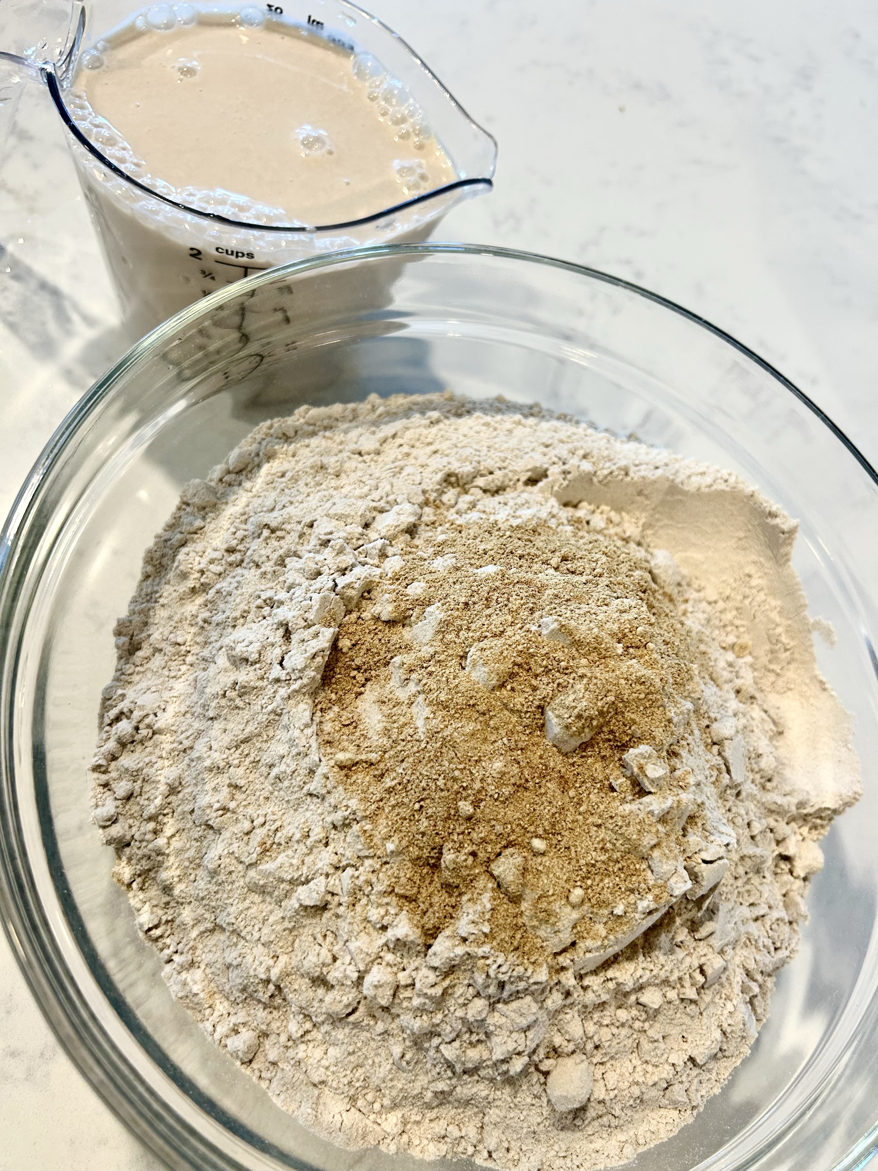 - Place the starter, teff flour, quinoa flour, and fenugreek in the stand mixer mixing bowl.