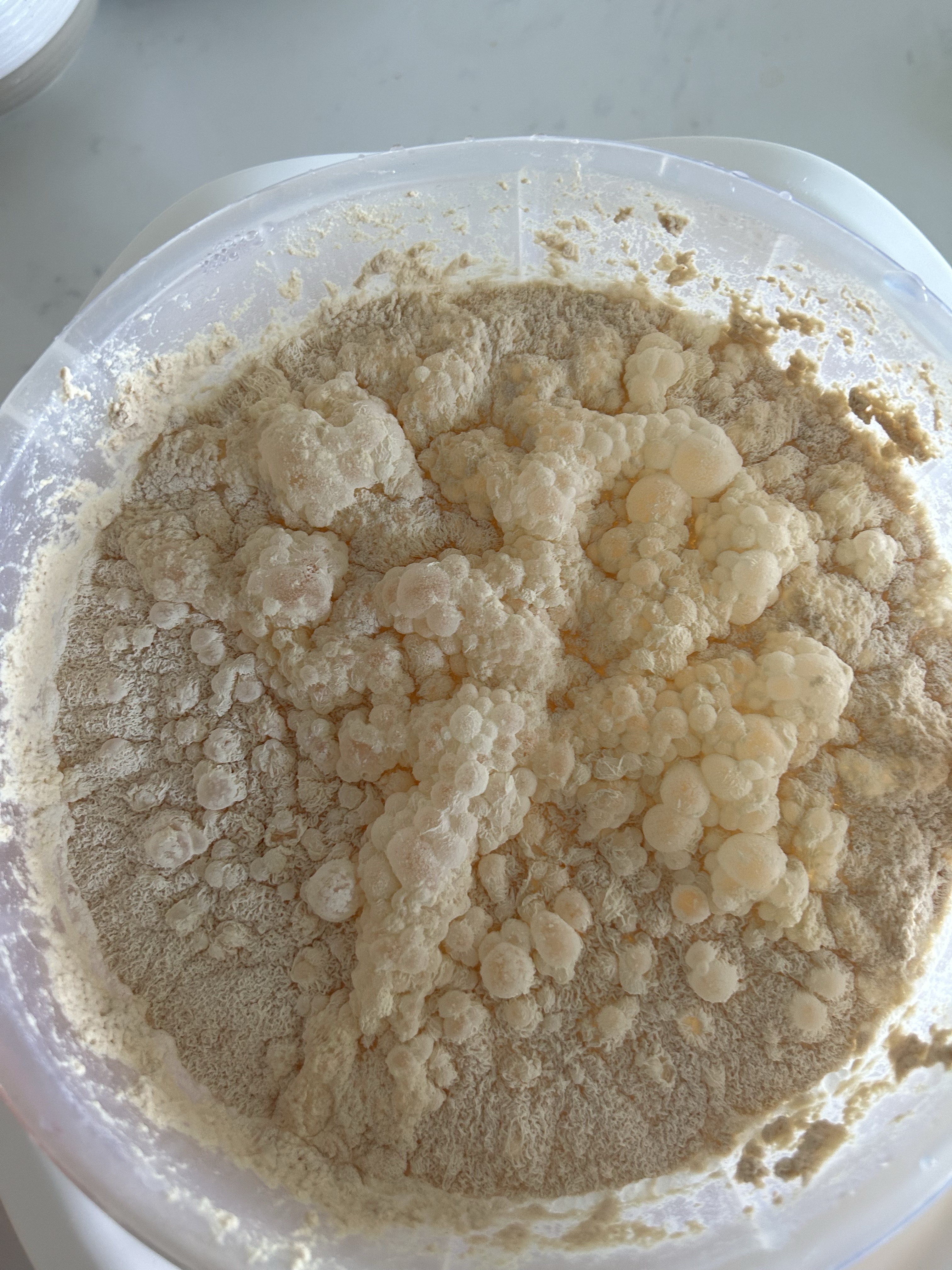 - Pour the starter, teff flour, quinoa flour (if you’re using quinoa seeds, do not add it at this stage), and fenugreek into the food-grade container.
