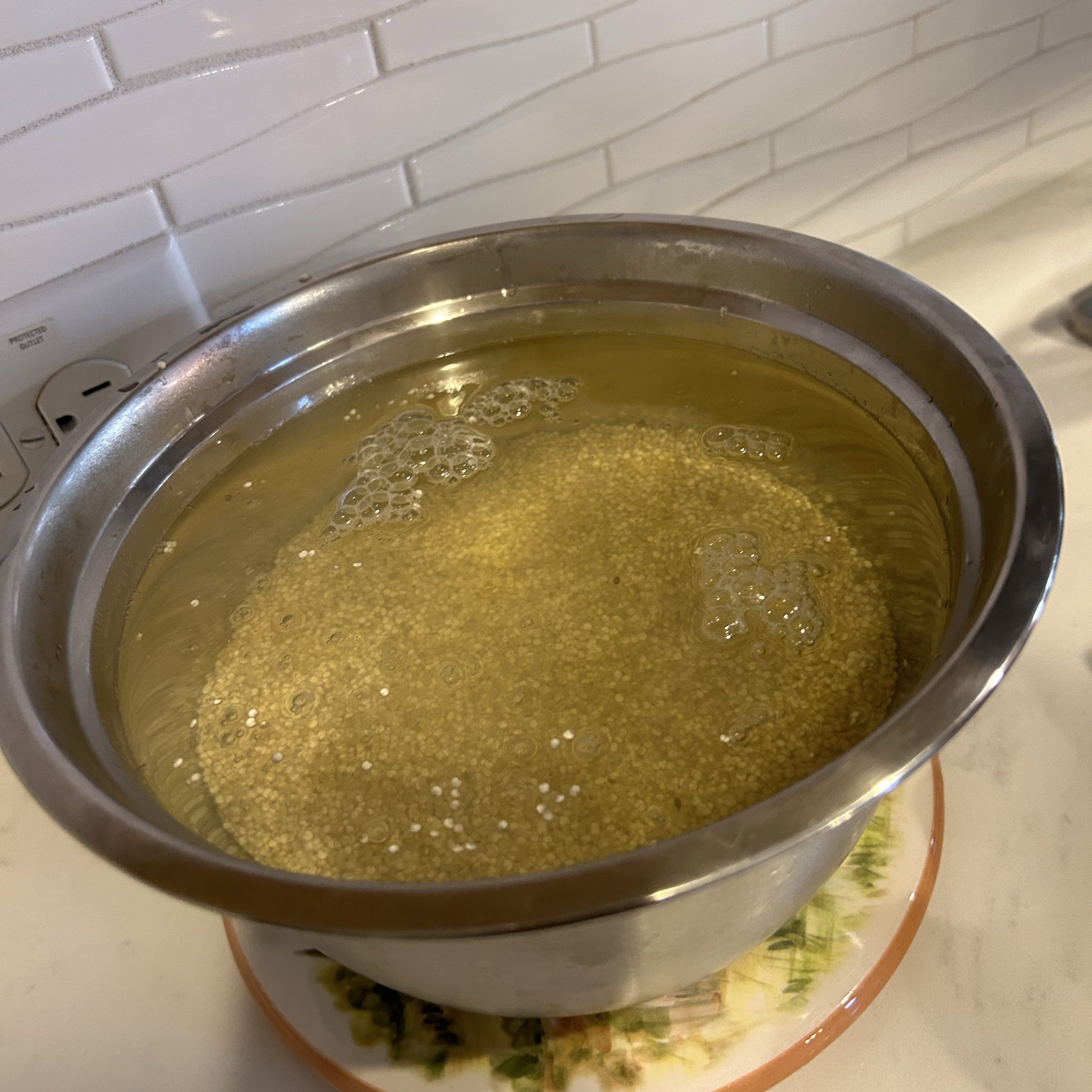 - In a saucepan, boil 4 cups of water. Carefully pour the hot water in a deep bowl with cover and soak quinoa seeds for 4 hours (skip to the 3rd step if quinoa flour was used on Day 1).