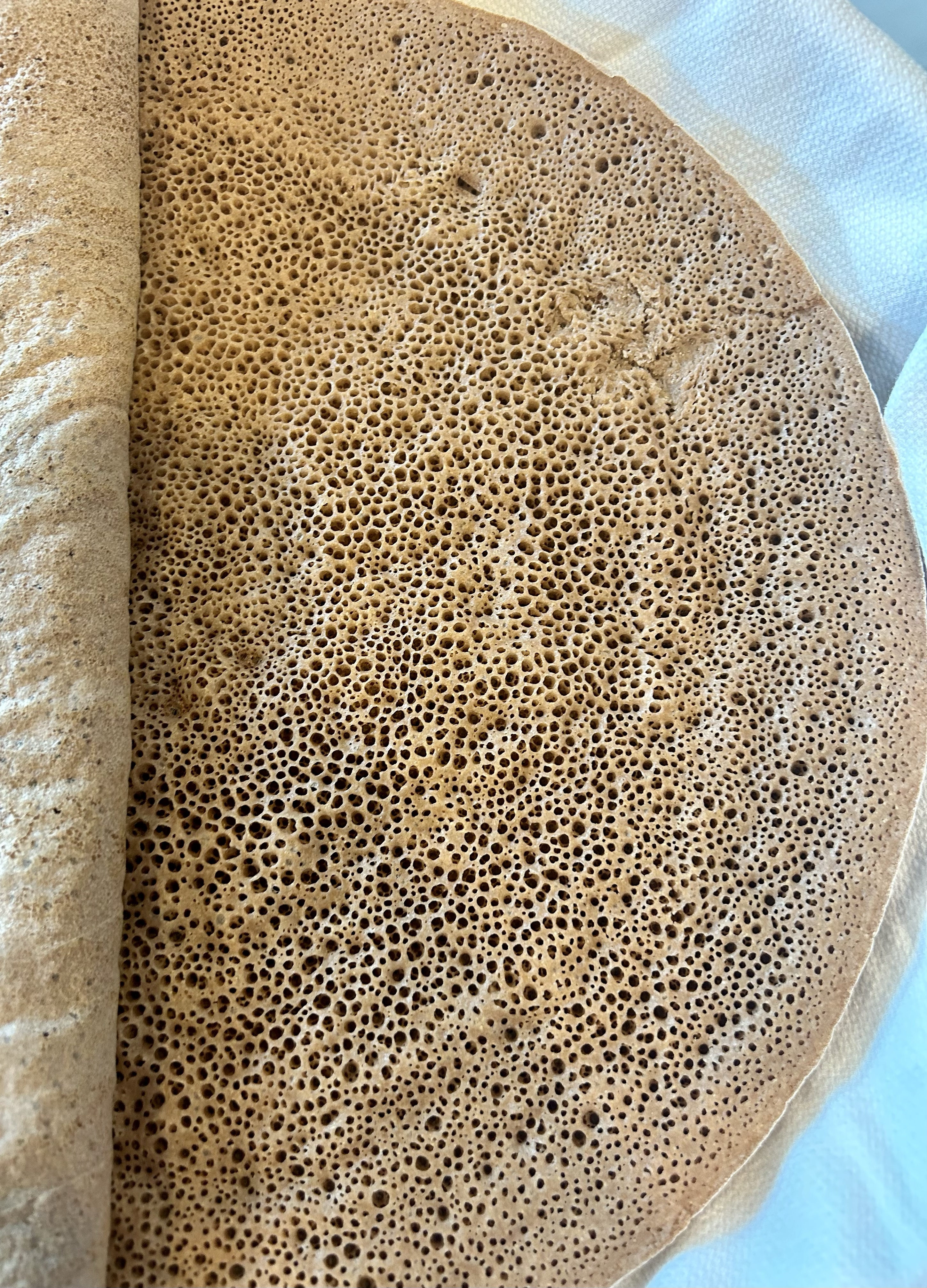 Injera is made from teff flour, which is a type of ancient grain indigenous to the region. Teff is a good source of dietary fiber, protein, iron, calcium, magnesium, zinc, and B vitamins especially B6 and B9 also known as folate. It is also low in fat and gluten free. Due to it’s nutritional content, teff has gained popularity in recent years.