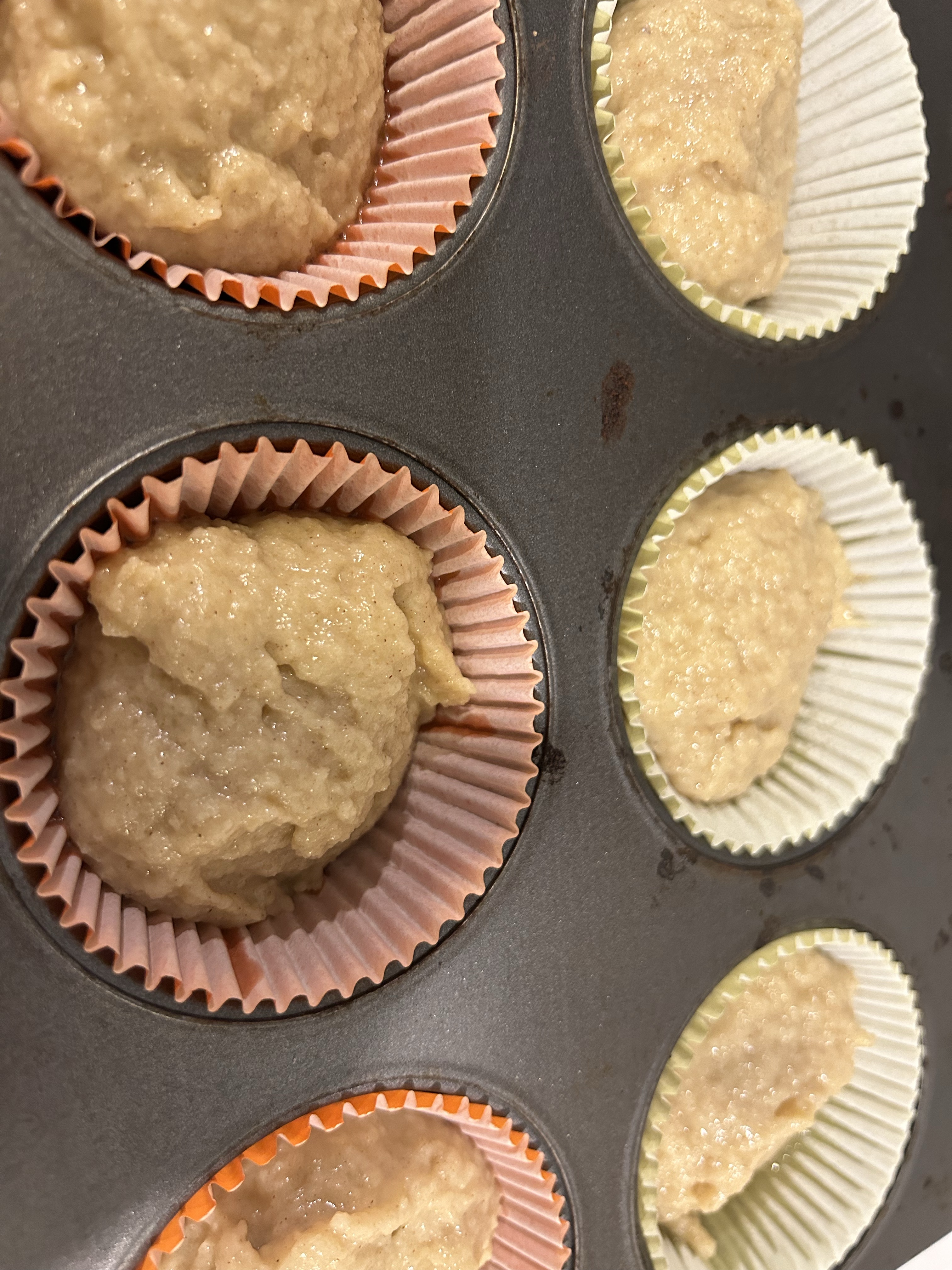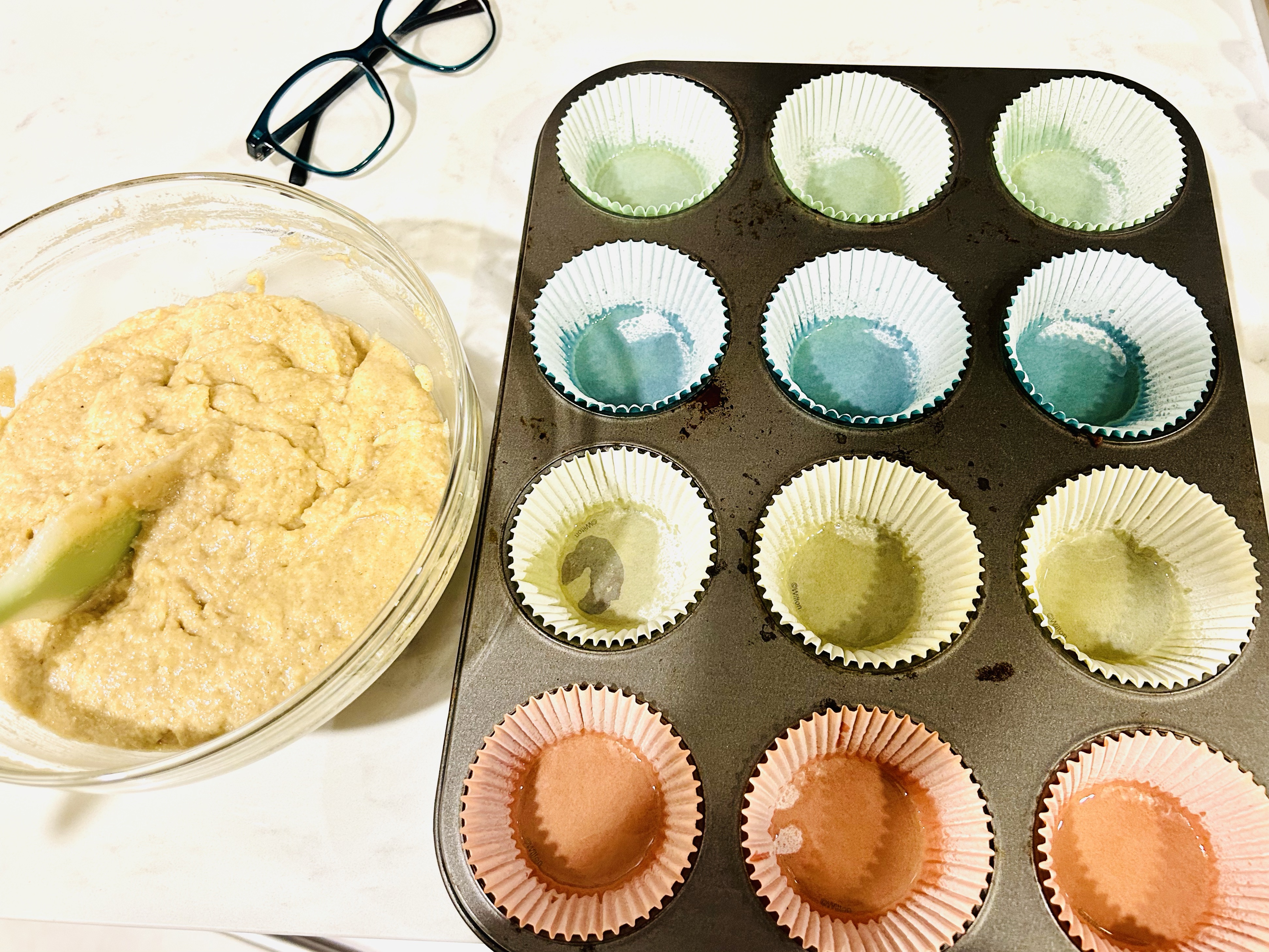 - Prepare your muffin pan by placing muffin liners and lightly spraying avocado oil to prevent sticking.