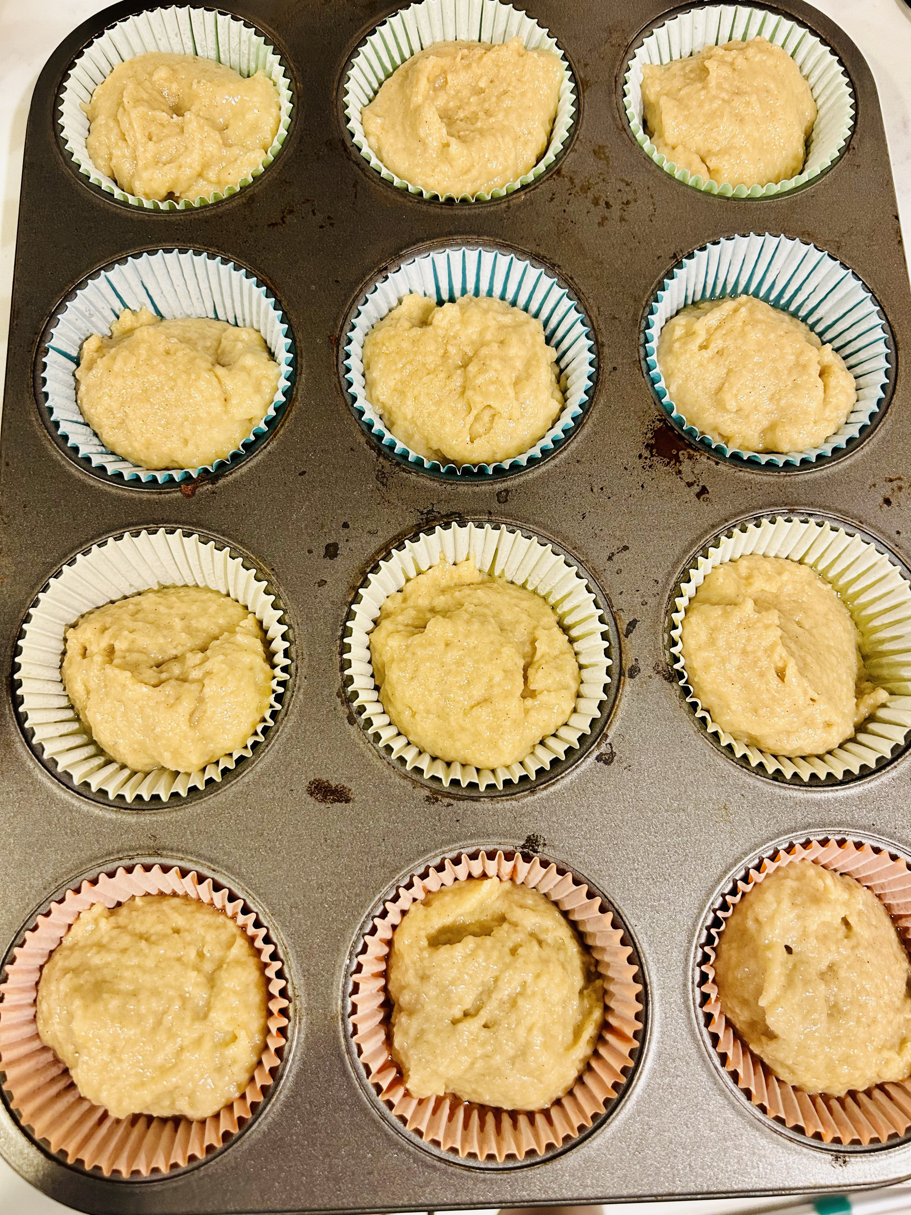 - Using a ¼ cup measure, pour the batter into the muffin tins.