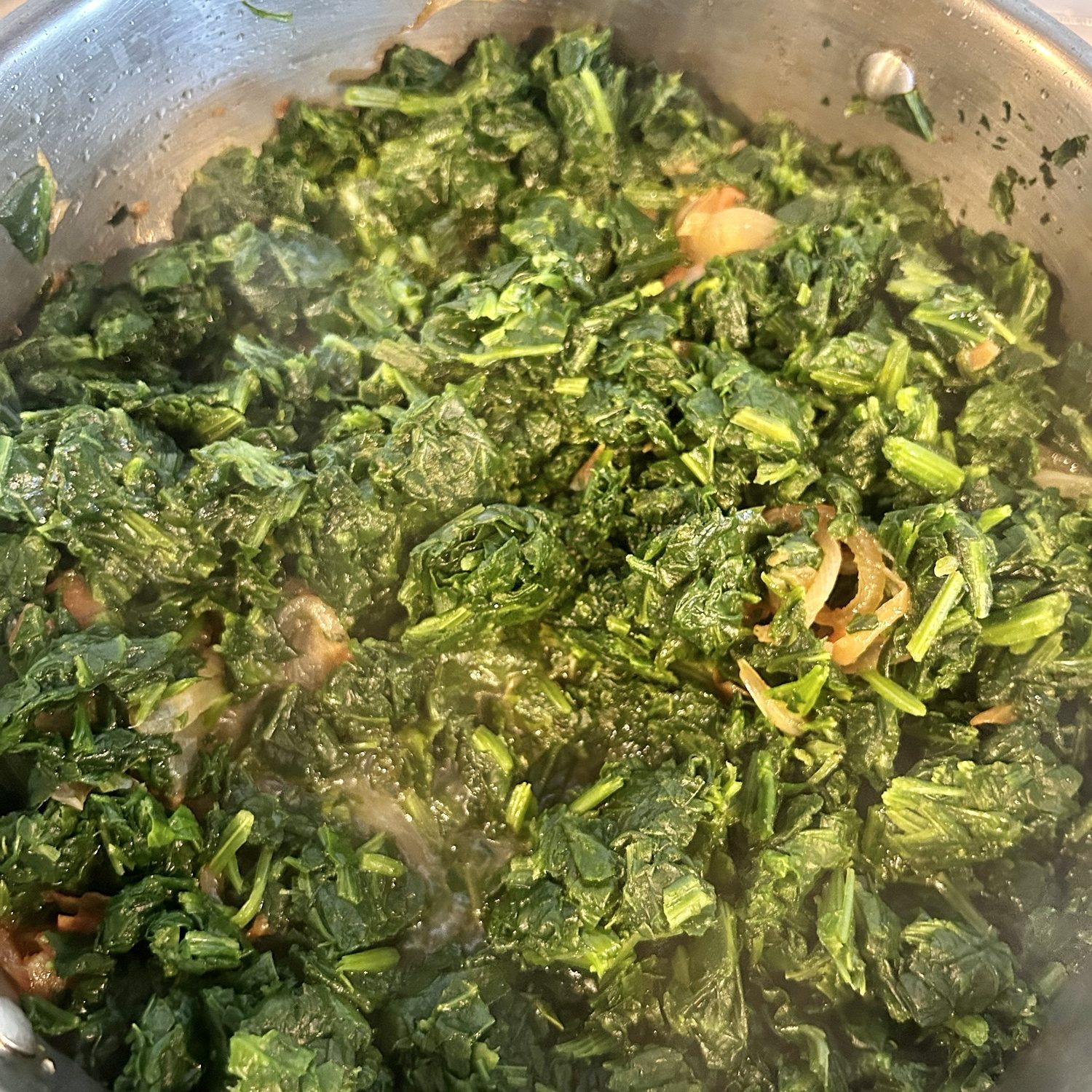 - Pour a splash of water into the skillet to create steam, which will help wilt the Swiss chards and integrate the flavors together.Water