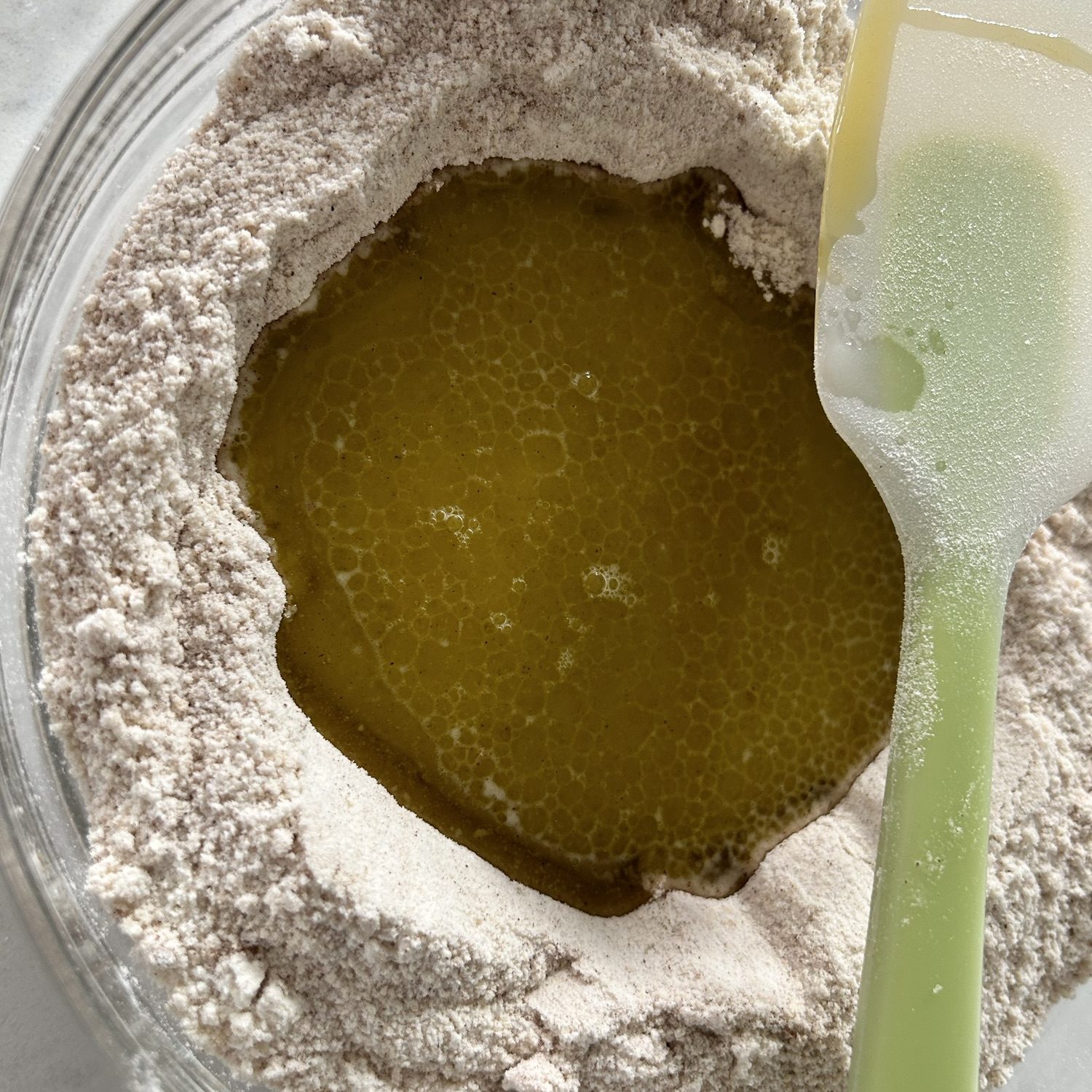 - Create a well in the center of the dry ingredients, and add the liquid ingredients – olive oil, vanilla extract, and oat milk. Mix until all ingredients are well incorporated,