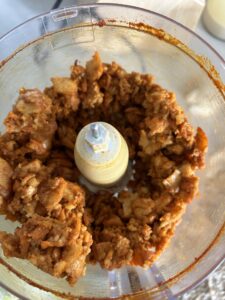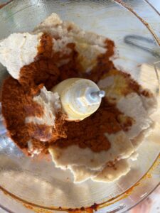 - Add the ingredients: Place the kitcha pieces in a food processor. Fill it halfway and then add a tablespoon each of Te’smi and berbere. Add more kitcha pieces. Process it all together on pulse.